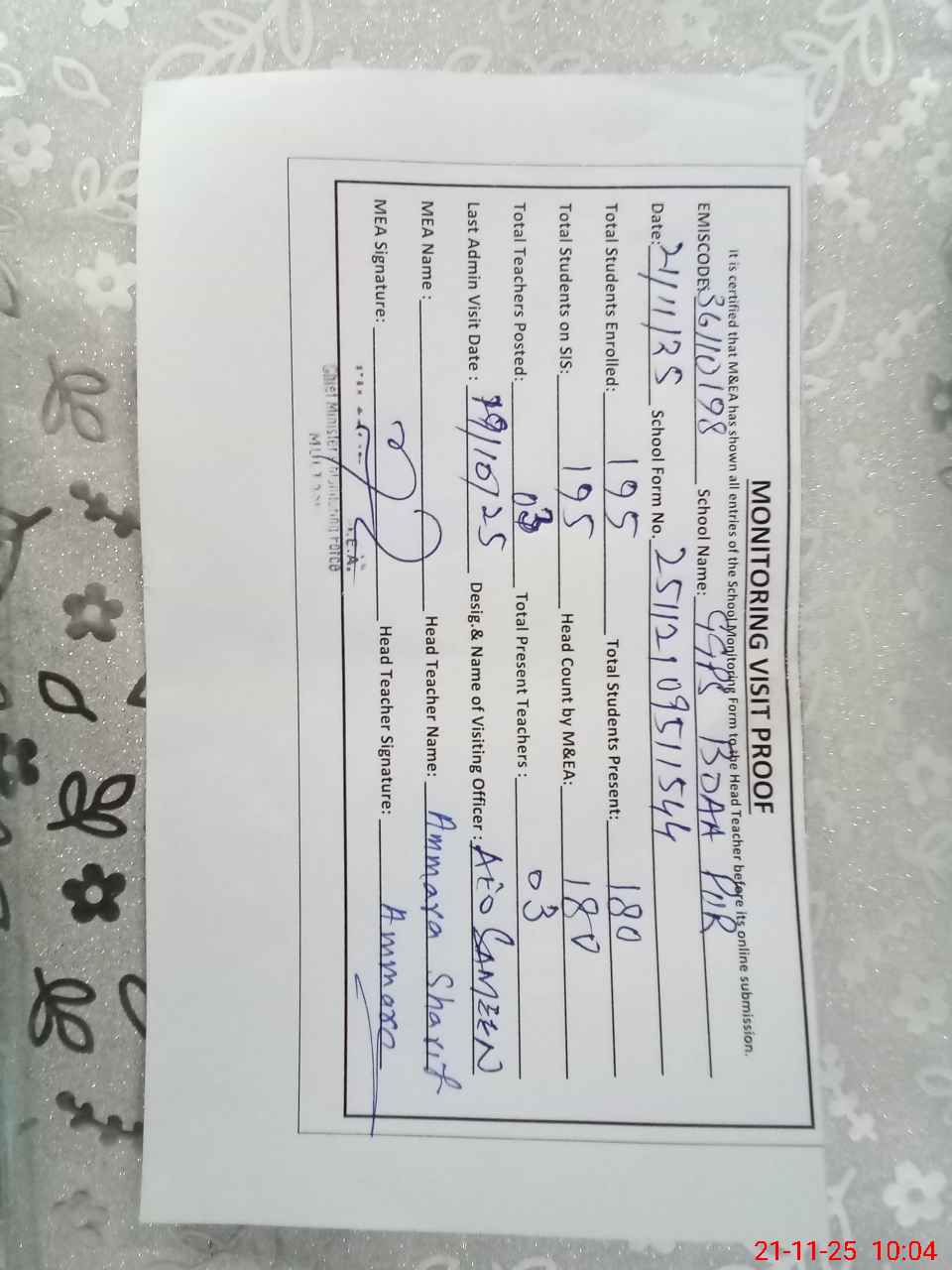 | Attendance Register | Head Teacher | MEA with School | Visit Proof |