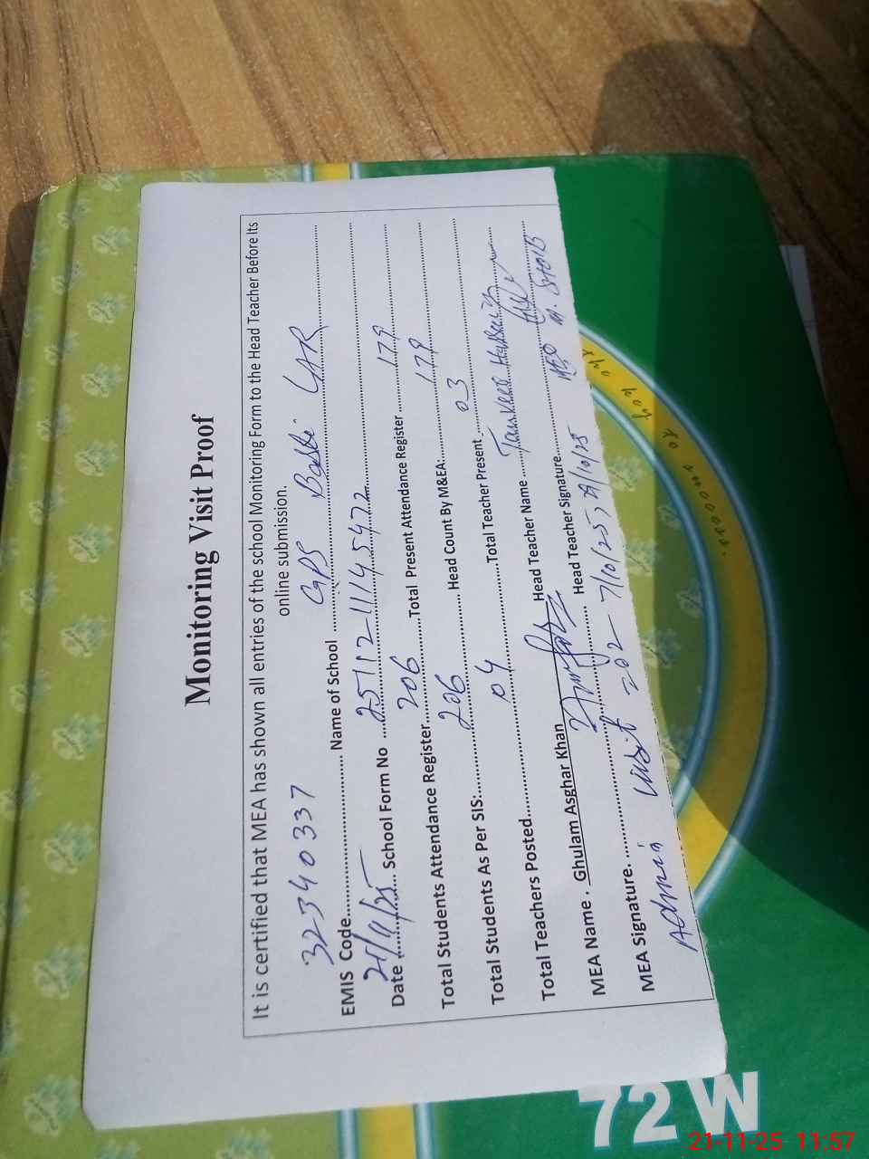 | Attendance Register | Head Teacher | MEA with School | Visit Proof |