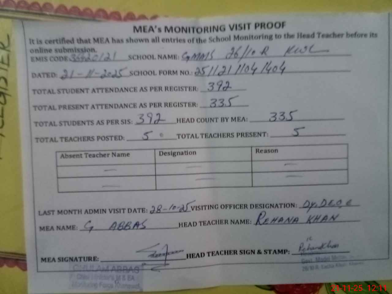 | Attendance Register | Head Teacher | MEA with School | Visit Proof |