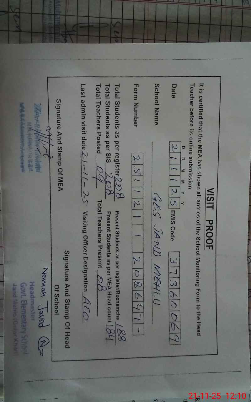 | EMIS Code: 37360069 | Name of School: GES JHAND MEHLO | |||