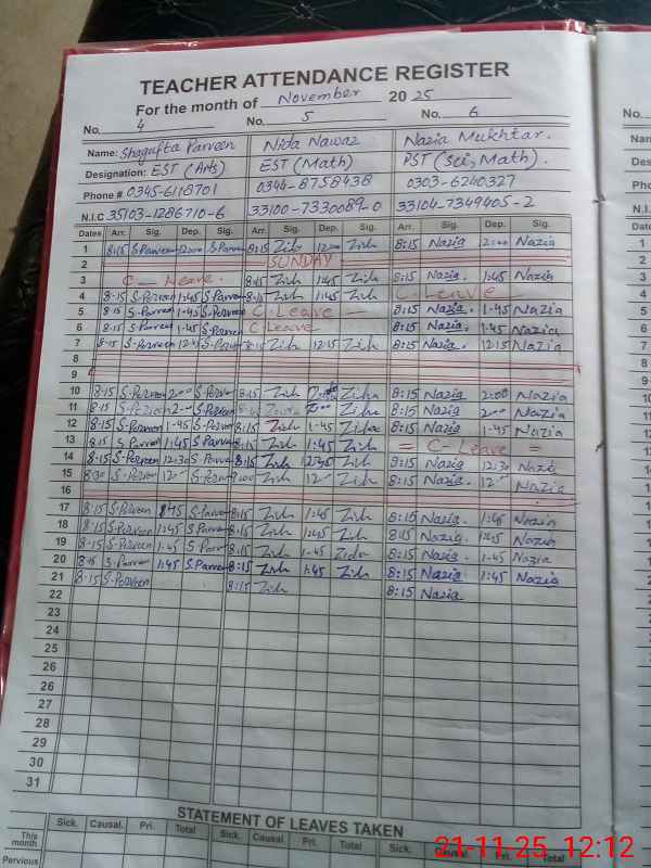 | CNIC | Full Name | Designation | R/C | Absence During Last Calender Month |