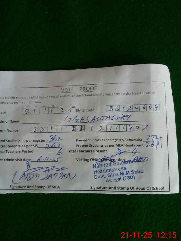 | Attendance Register | Head Teacher | MEA with School | Visit Proof |