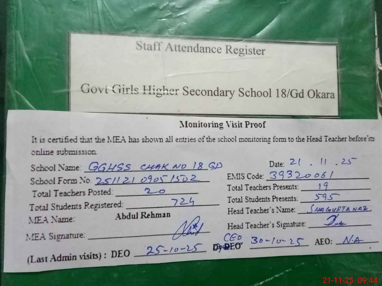 | Attendance Register | Head Teacher | MEA with School | Visit Proof |