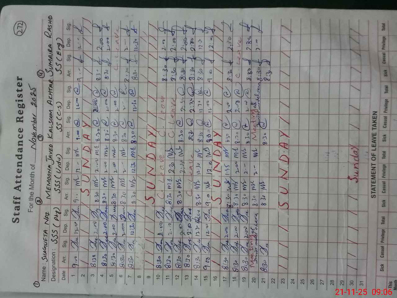 | CNIC | Full Name | Designation | R/C | Absence During Last Calender Month |
