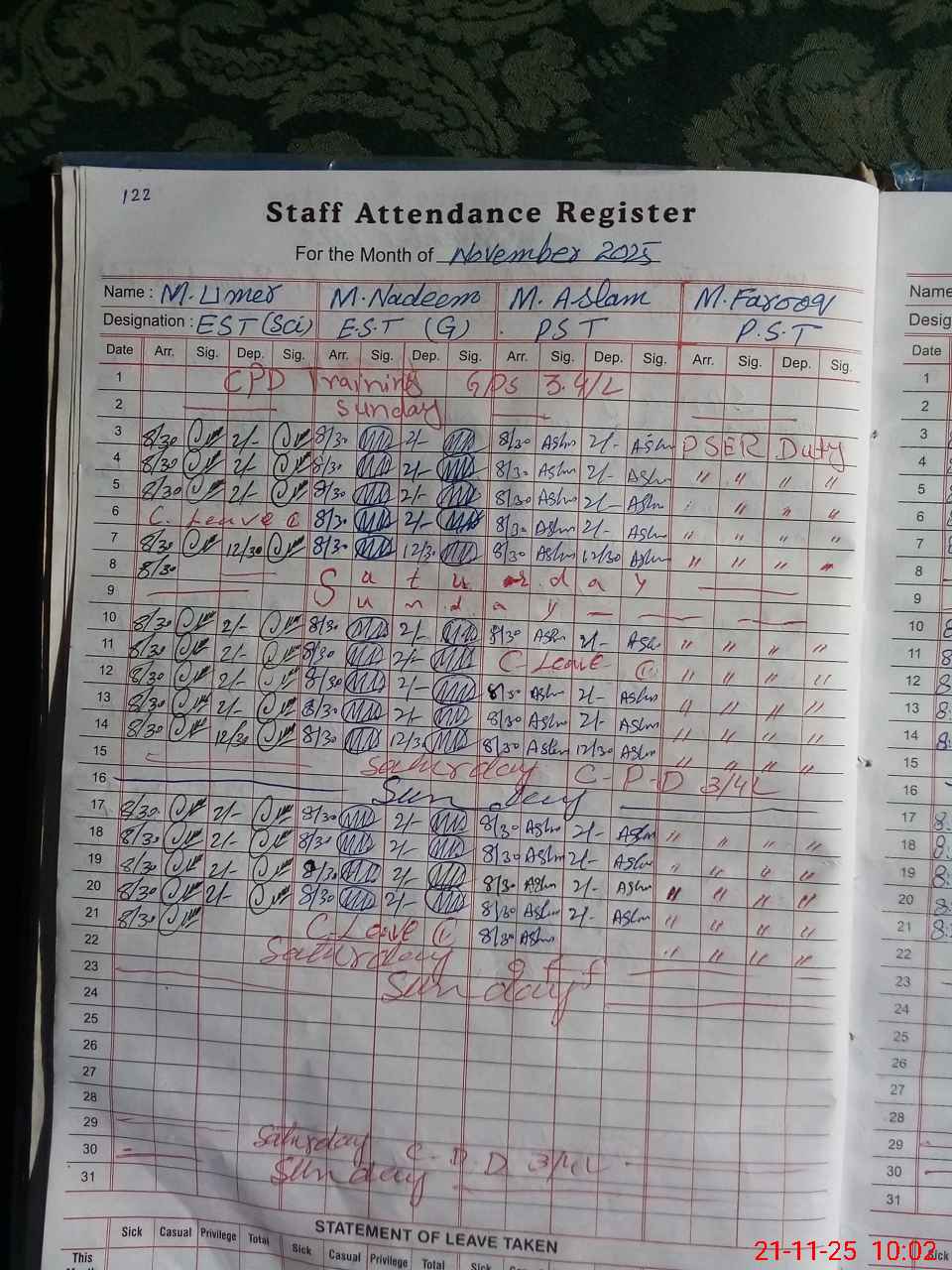| Leave | Duty | Absent | Maternity | Medical | Ex- Pak |