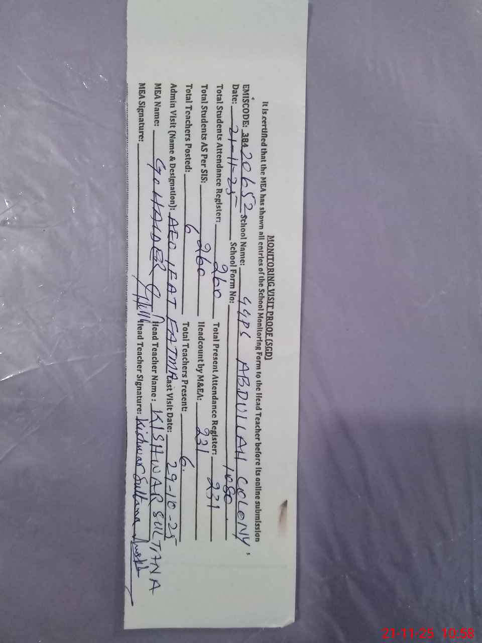 | Attendance Register | Head Teacher | MEA with School | Visit Proof |