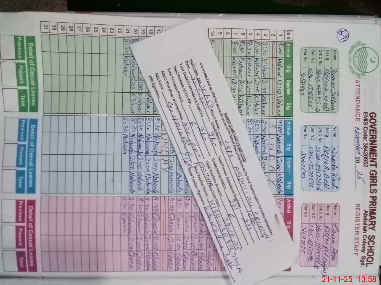 | Name: KI**** SU**** Designation: (School Headmaster's/Headmistress's) PST Phone/Cell Number: 03**** |
