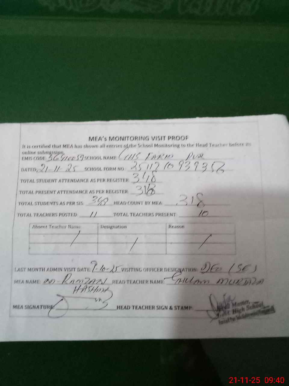 | Attendance Register | Head Teacher | MEA with School | Visit Proof |