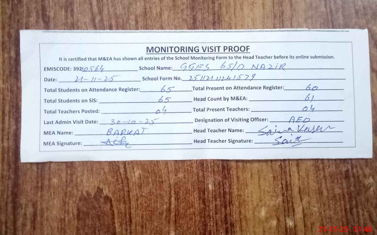 | EMIS Code: 39210564 | Name of School: GGES 65/D NAZIR | |||