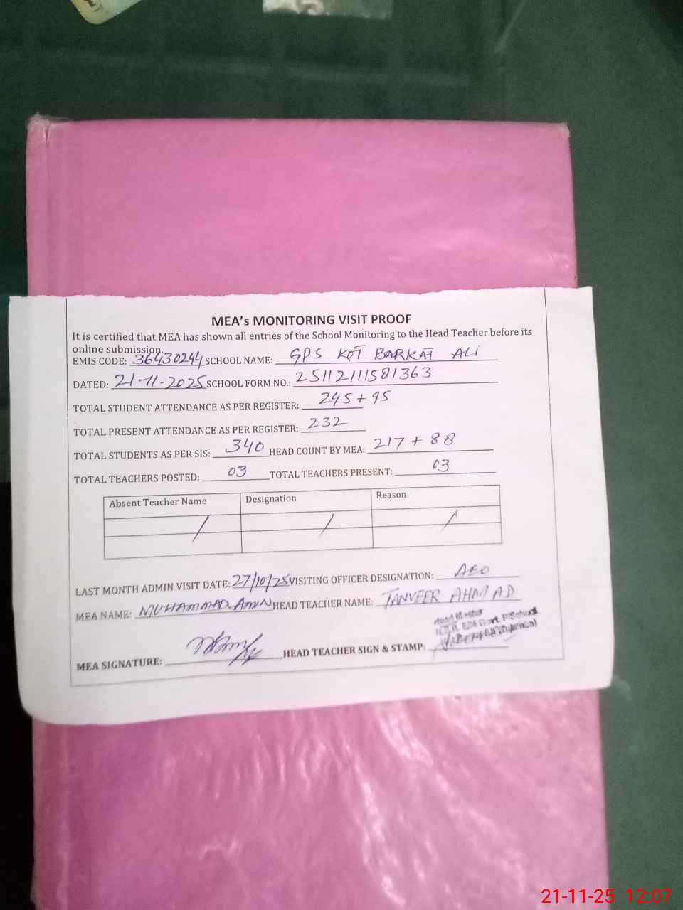 | EMIS Code: 36430244 | Name of School: GPS KOT BARKAT ALI, TULAMBA | |||