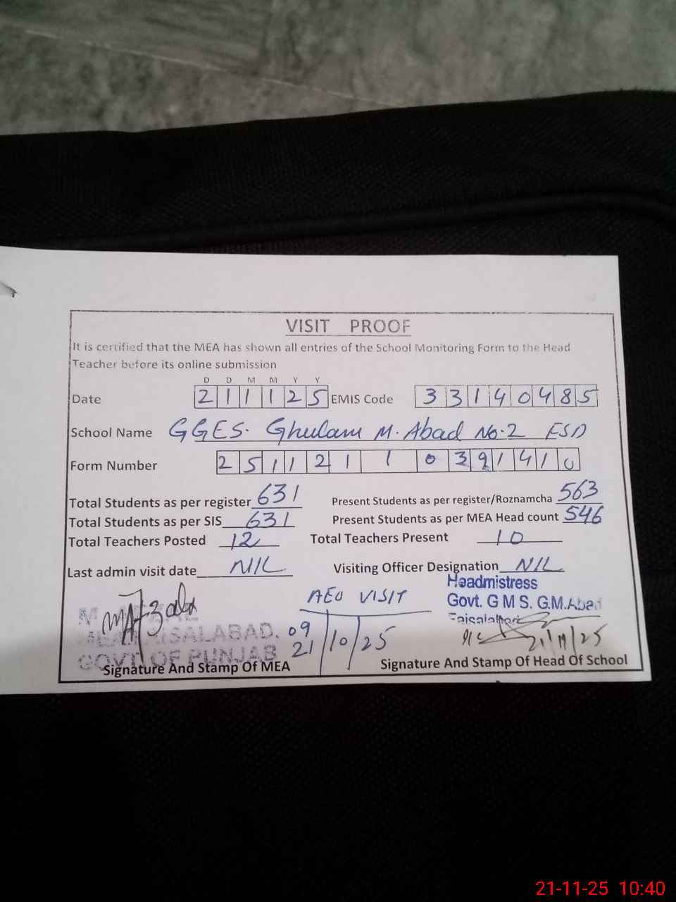| EMIS Code: 33140485 | Name of School: GGES GHULAM MUHAMMAD ABAD NO. 2 | |||