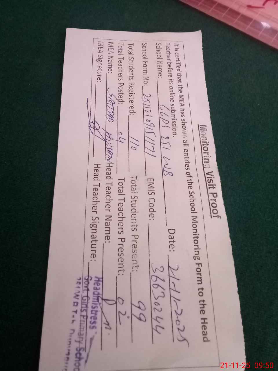 | Attendance Register | Head Teacher | MEA with School | Visit Proof |