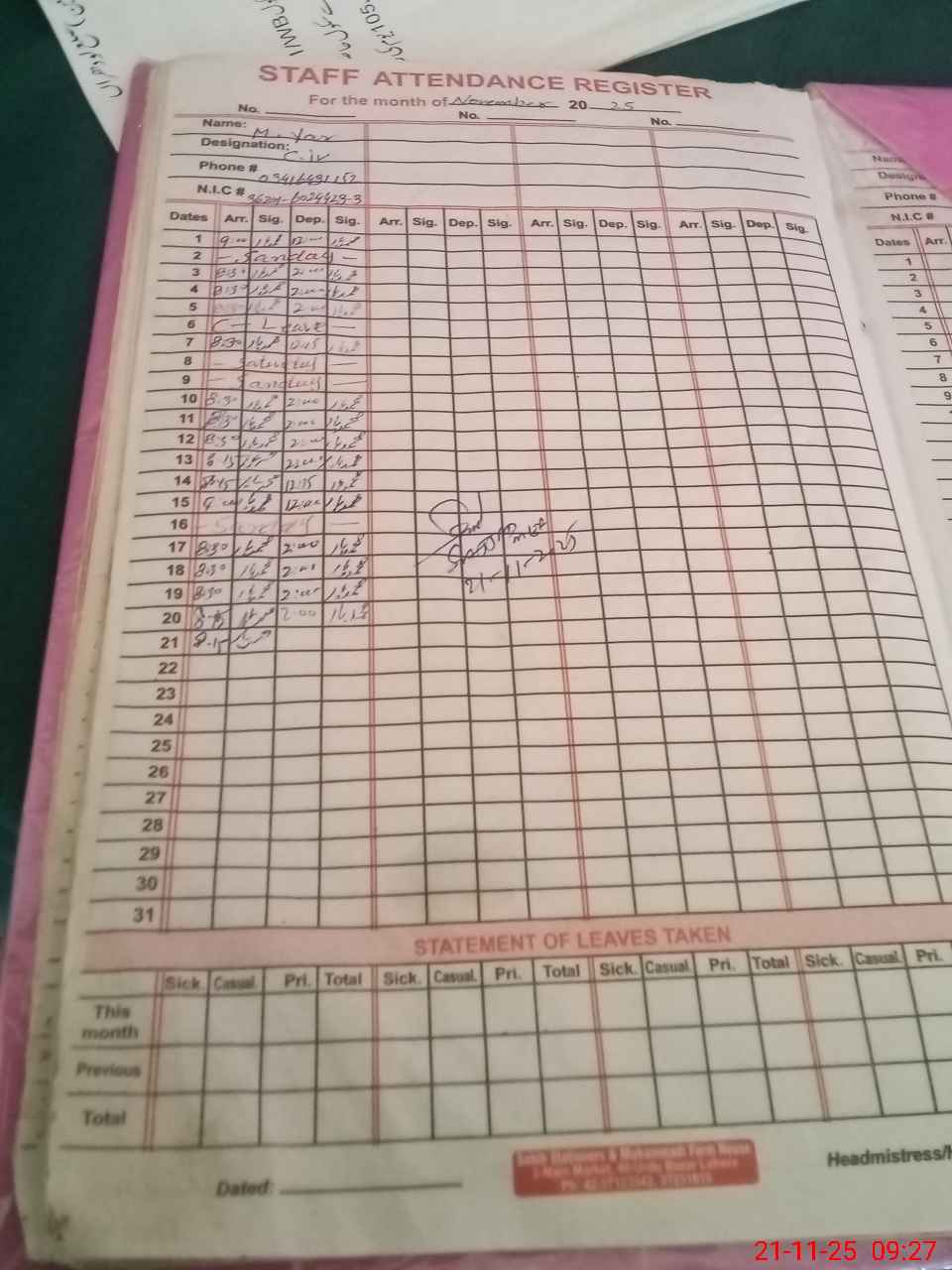 | CNIC | Full Name | Designation | R/C | Absence During Last Calender Month |