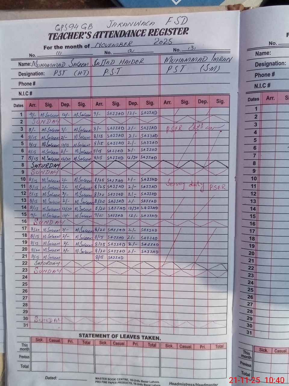 | CNIC | Full Name | Designation | R/C | Absence During Last Calender Month |