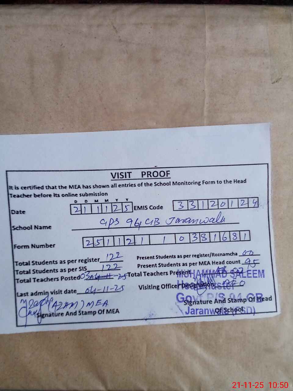 | Attendance Register | Head Teacher | MEA with School | Visit Proof |