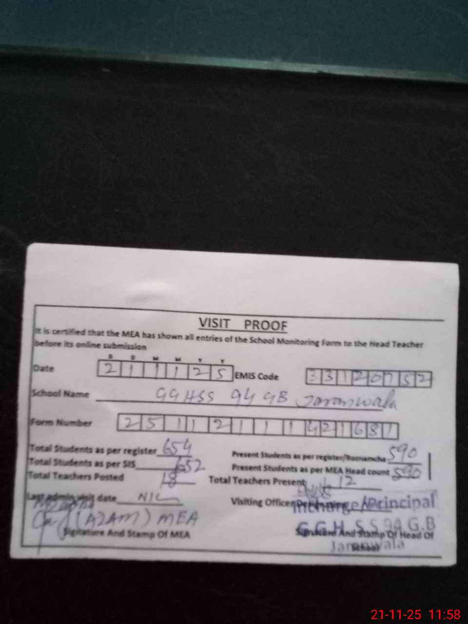| Attendance Register | Head Teacher | MEA with School | Visit Proof |