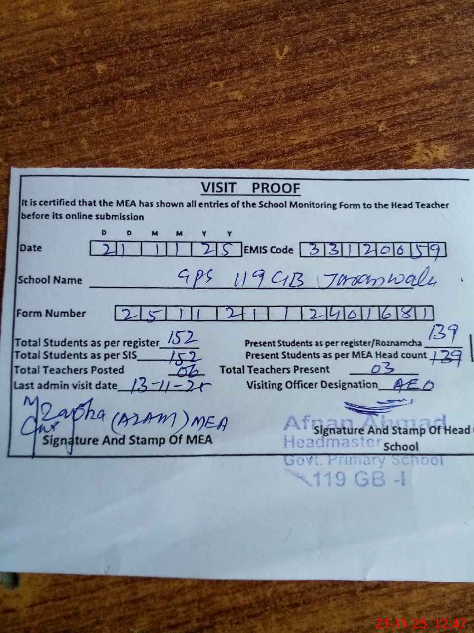 | EMIS Code: 33120059 | Name of School: GPS CHAK 119 GB JARANWALA | |||