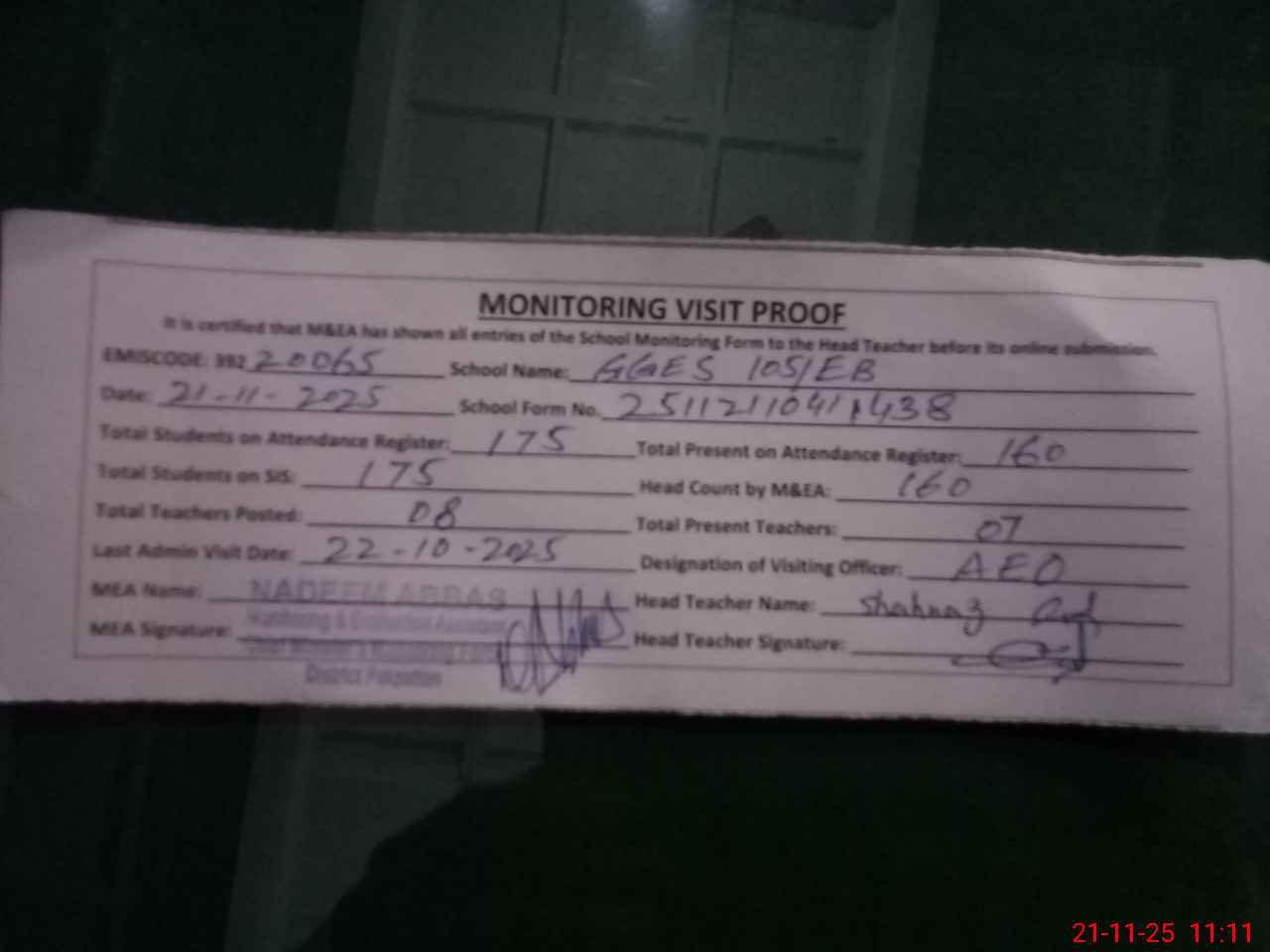 | Attendance Register | Head Teacher | MEA with School | Visit Proof |