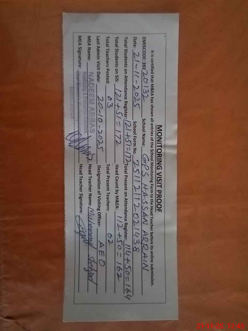 | Attendance Register | Head Teacher | MEA with School | Visit Proof |
