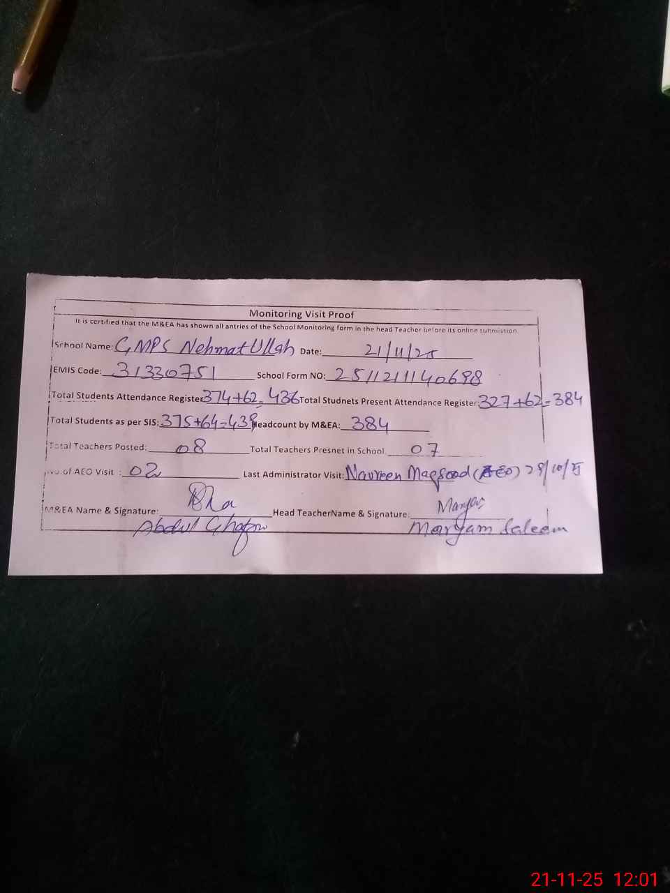| Attendance Register | Head Teacher | MEA with School | Visit Proof |