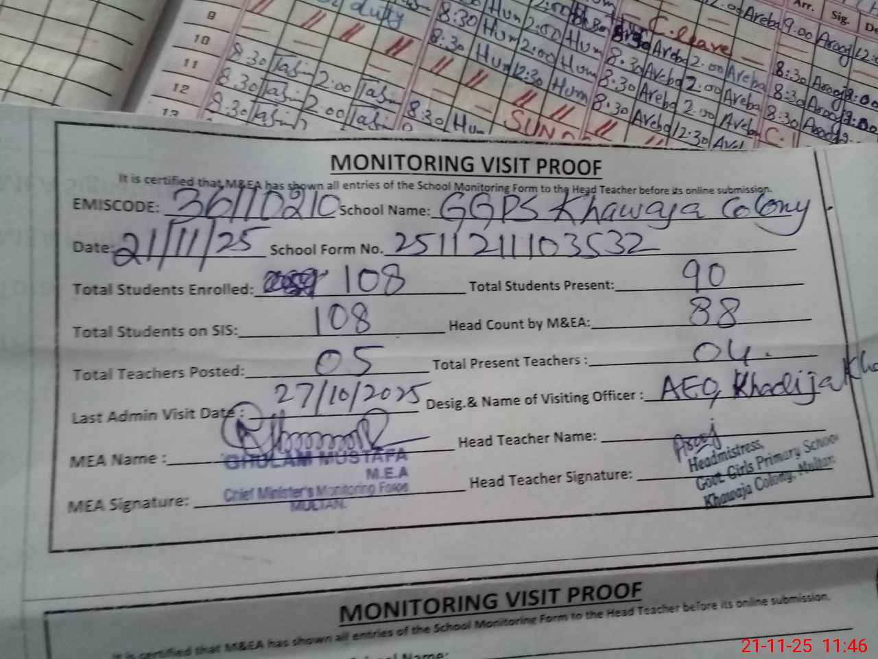 | Attendance Register | Head Teacher | MEA with School | Visit Proof |