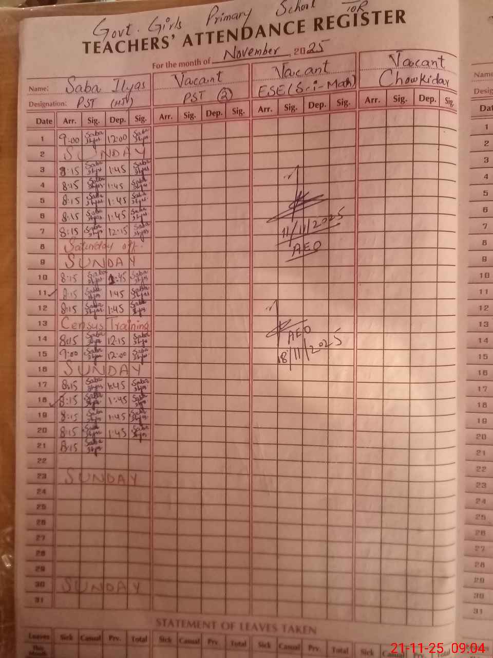 | Leave | Duty | Absent | Maternity | Medical | Ex- Pak |