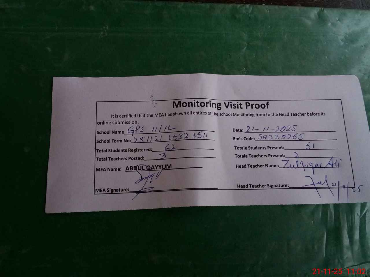 | EMIS Code: 39330265 | Name of School: GPS CHAK 11/IL | |||