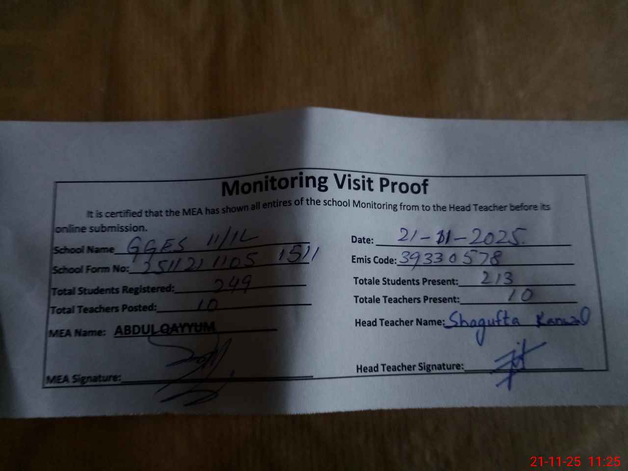 | Attendance Register | Head Teacher | MEA with School | Visit Proof |