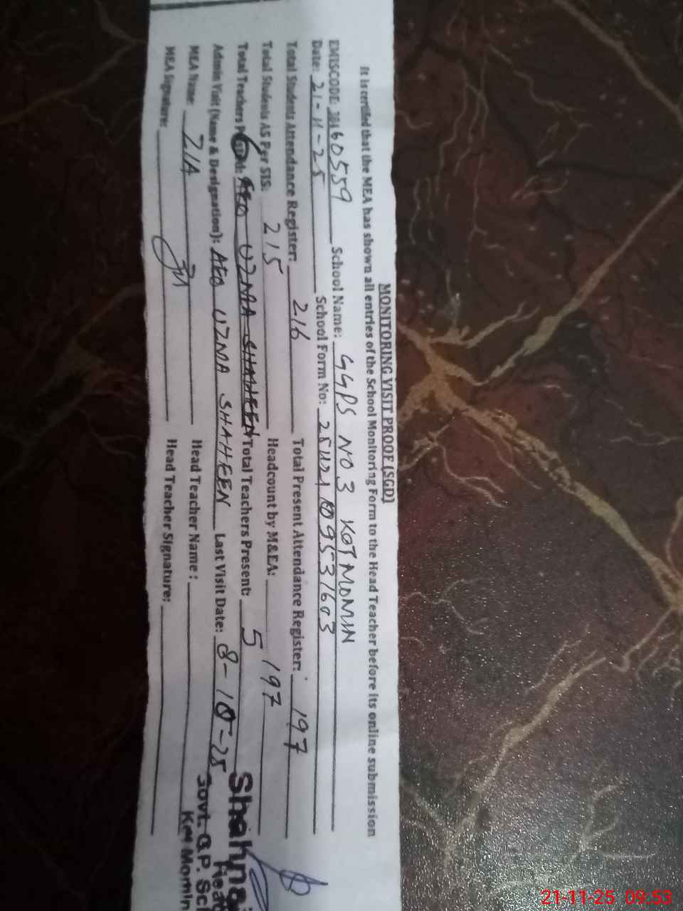 | Attendance Register | Head Teacher | MEA with School | Visit Proof |