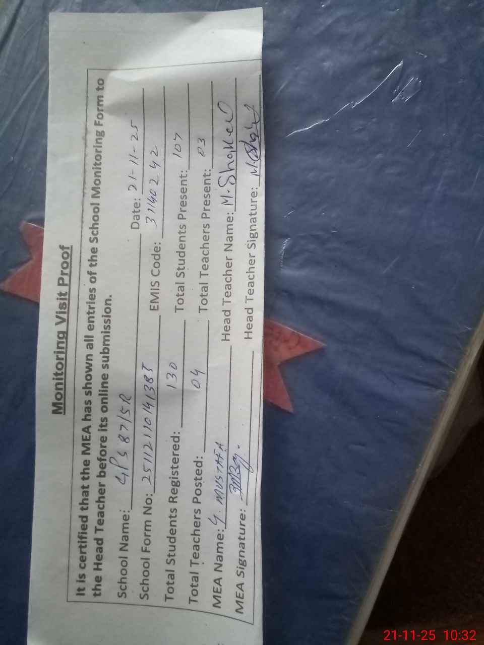| Attendance Register | Head Teacher | MEA with School | Visit Proof |