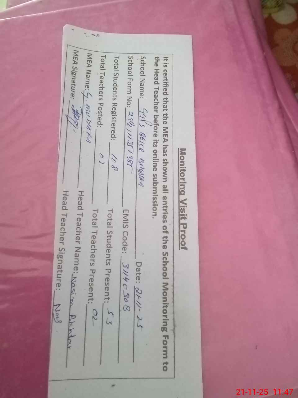 | Attendance Register | Head Teacher | MEA with School | Visit Proof |