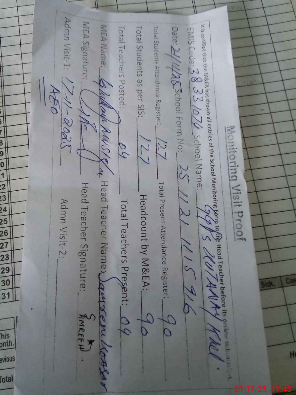 | Attendance Register | Head Teacher | MEA with School | Visit Proof |