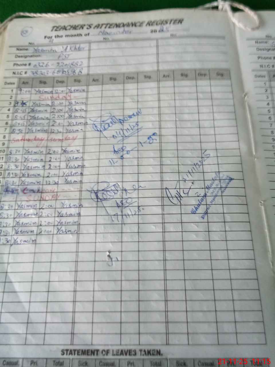 | CNIC | Full Name | Designation | R/C | Absence During Last Calender Month |