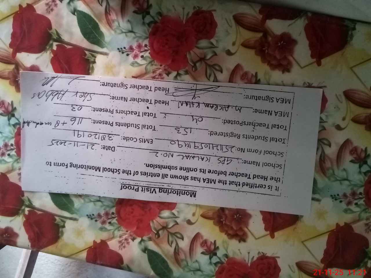 | Attendance Register | Head Teacher | MEA with School | Visit Proof |