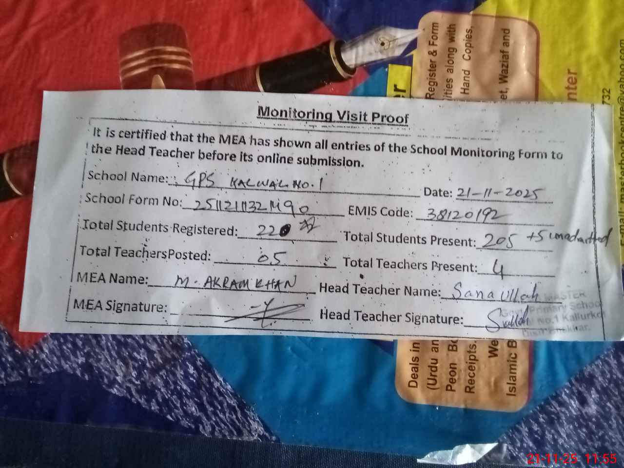 | Attendance Register | Head Teacher | MEA with School | Visit Proof |