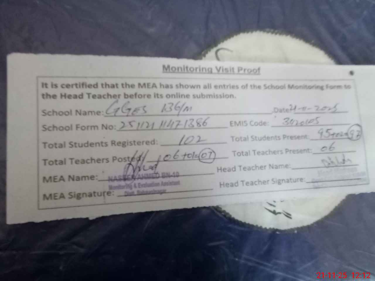 | Attendance Register | Head Teacher | MEA with School | Visit Proof |
