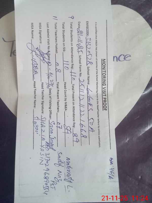 | Monitoring Date: 21-11-2025 | Start Time: 21-11-2025 10:54 AM | End Time: 21-11-2025 11:32 AM | Name of MEA: Za**** Iq**** | |