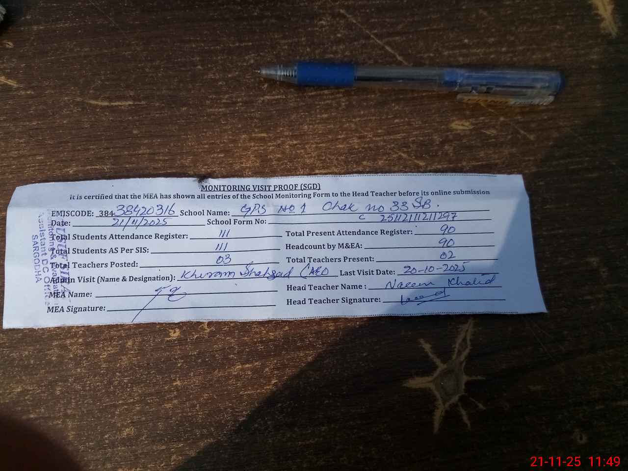 | EMIS Code: 38420316 | Name of School: GPS NO.1 CHAK NO.33 SB | |||