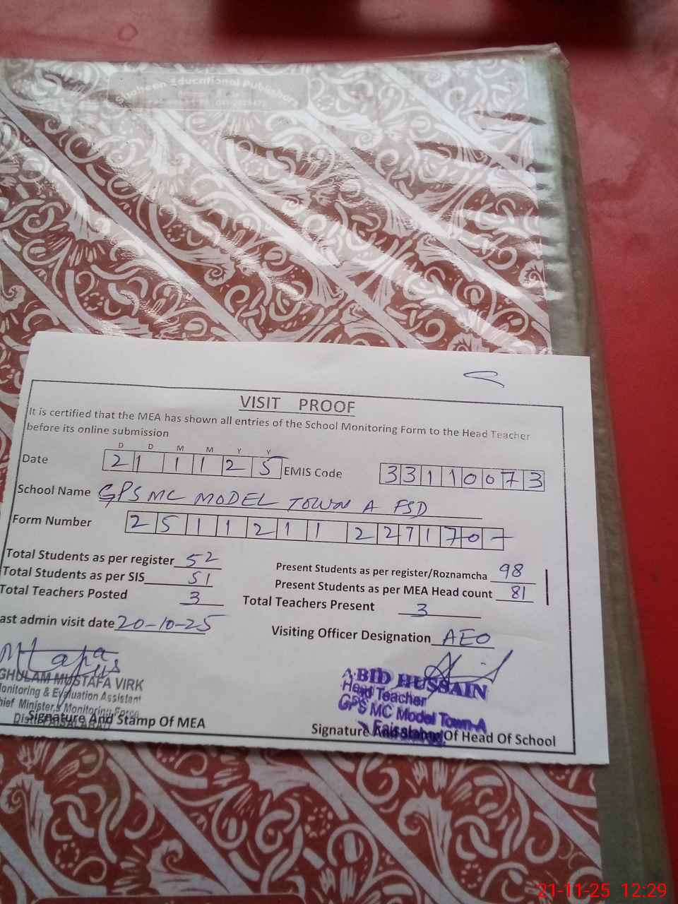 | EMIS Code: 33110073 | Name of School: GPS MC MODEL TOWN A FSD | |||