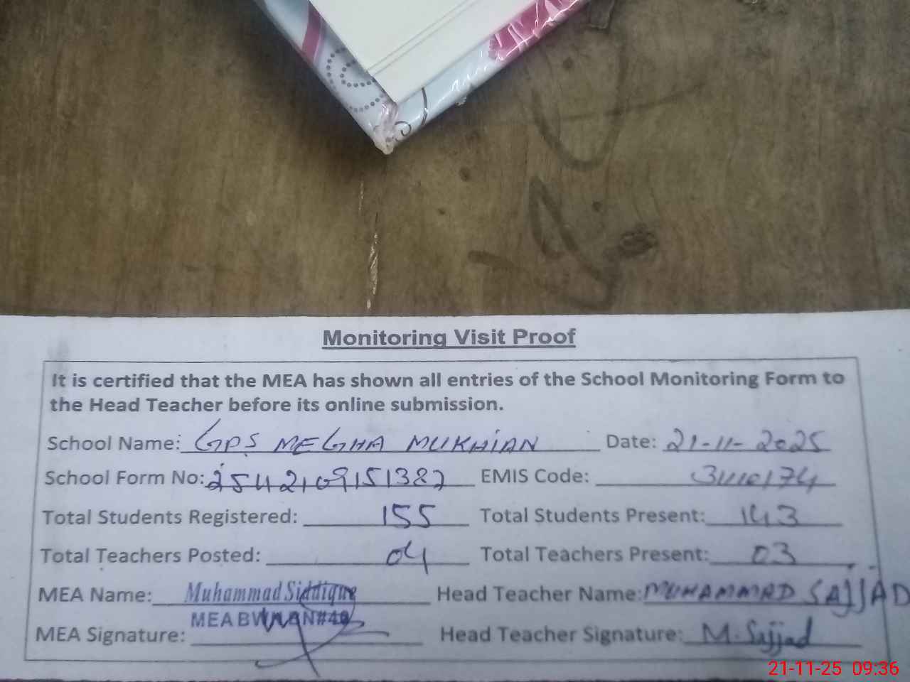 | Attendance Register | Head Teacher | MEA with School | Visit Proof |