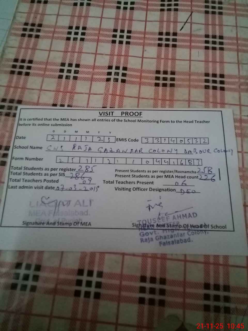 | Attendance Register | Head Teacher | MEA with School | Visit Proof |