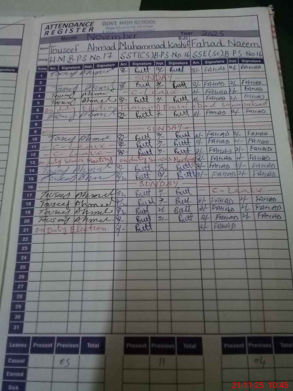 | CNIC | Full Name | Designation | R/C | Absence during last cal. month |