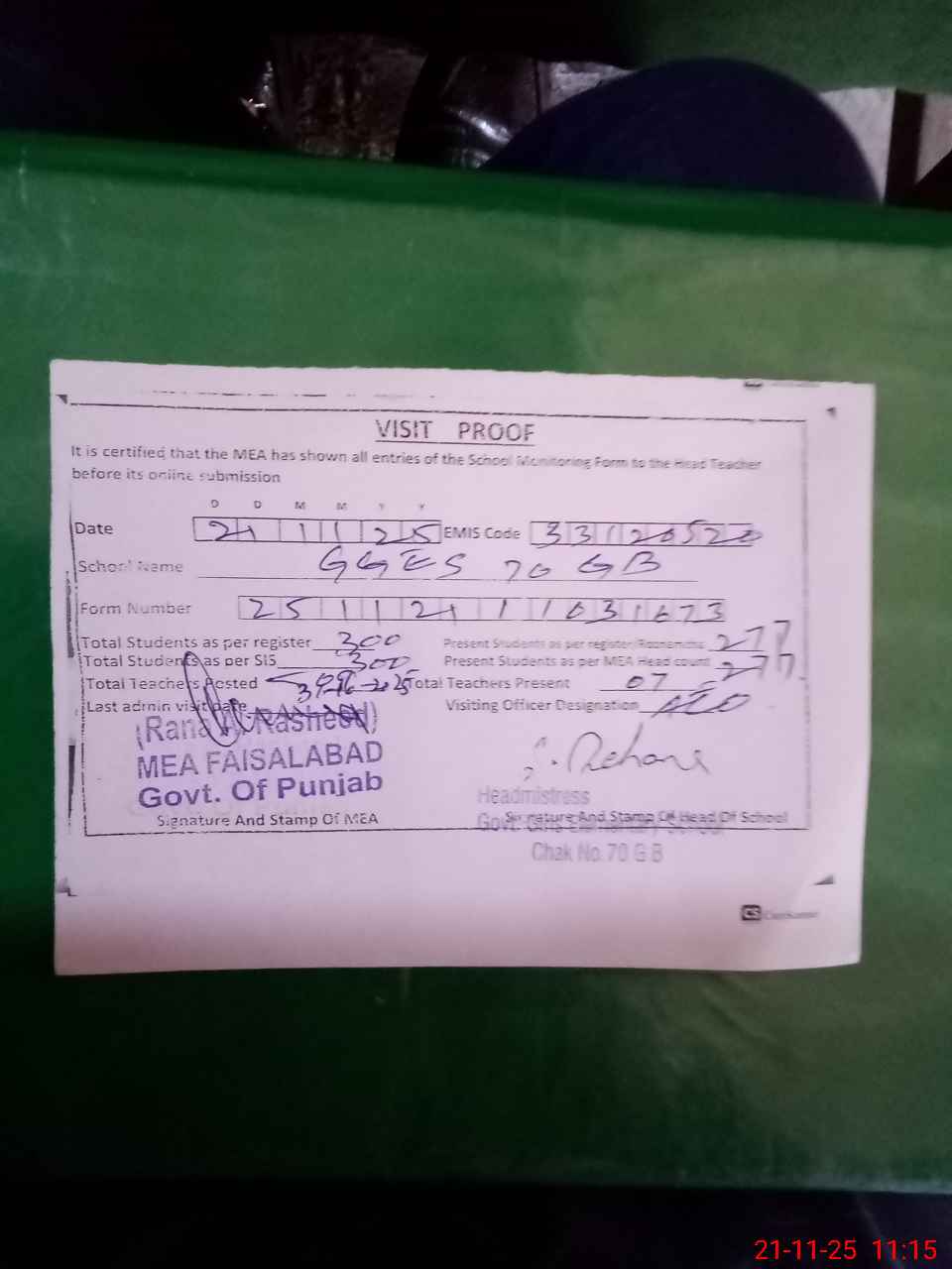 | Attendance Register | Head Teacher | MEA with School | Visit Proof |
