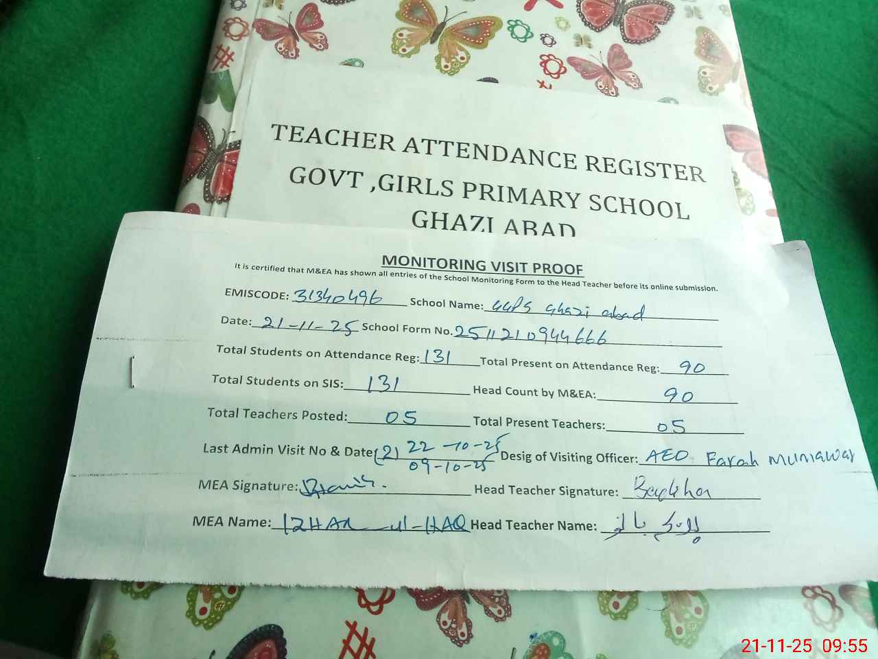 | Attendance Register | Head Teacher | MEA with School | Visit Proof |