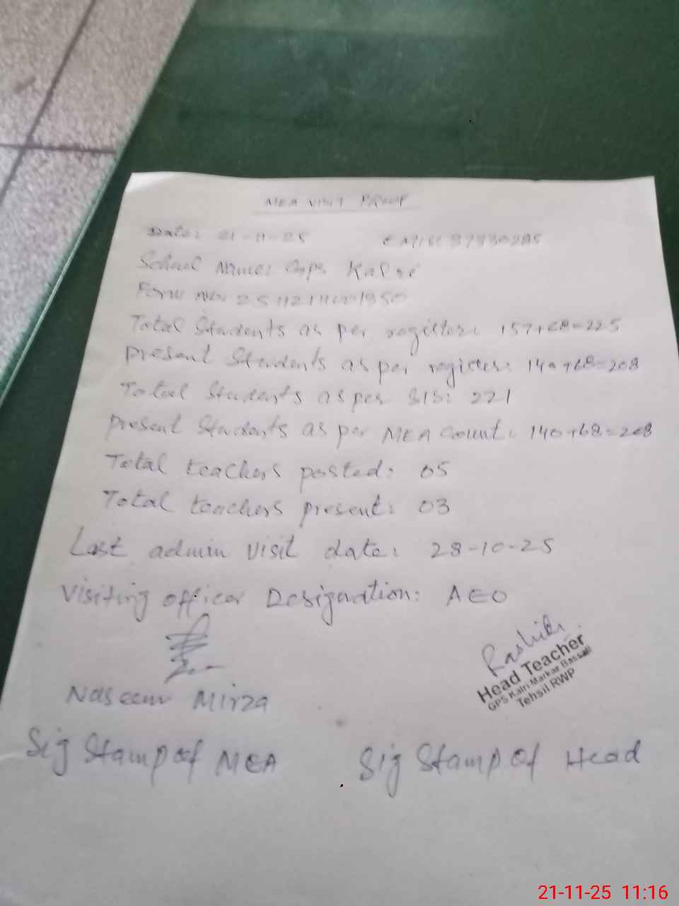 | Attendance Register | Head Teacher | MEA with School | Visit Proof |