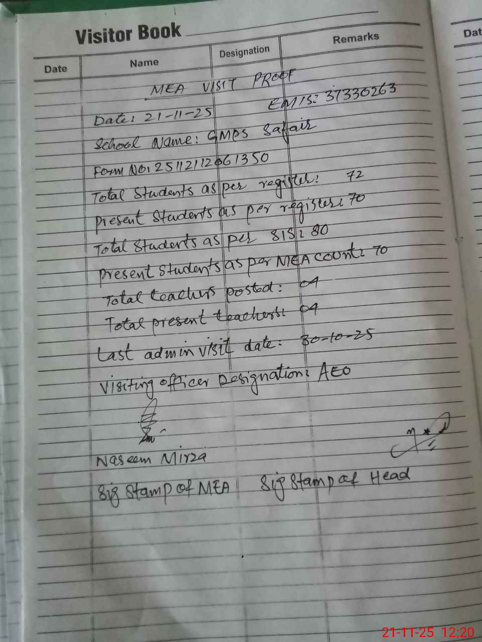 | Attendance Register | Head Teacher | MEA with School | Visit Proof |