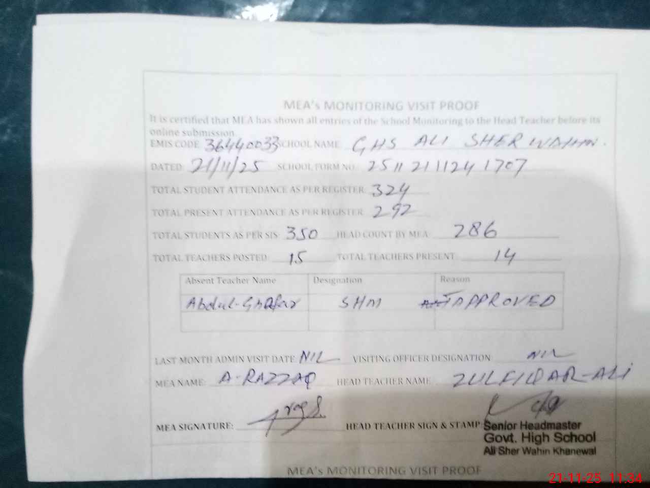 | EMIS Code: 36440033 | Name of School: GHS ALI SHER WAHIN, JAHANIAN | |||