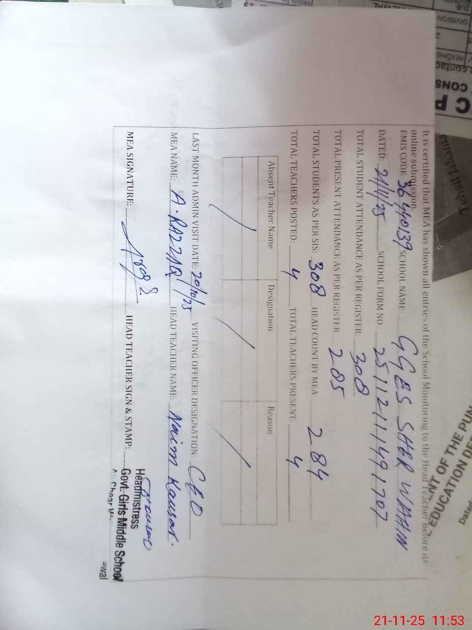 | EMIS Code: 36440139 | Name of School: GGES ALI SHER WAHIN, JAHANIAN | |||