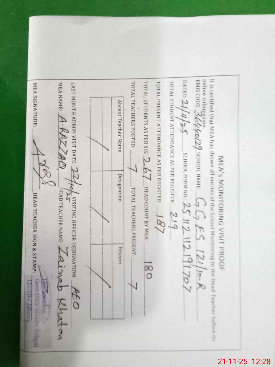 | Attendance Register | Head Teacher | MEA with School | Visit Proof |
