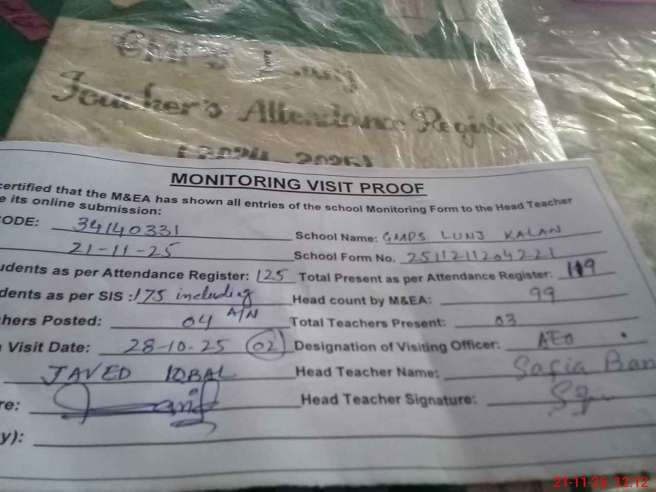 | Attendance Register | Head Teacher | MEA with School | Visit Proof |